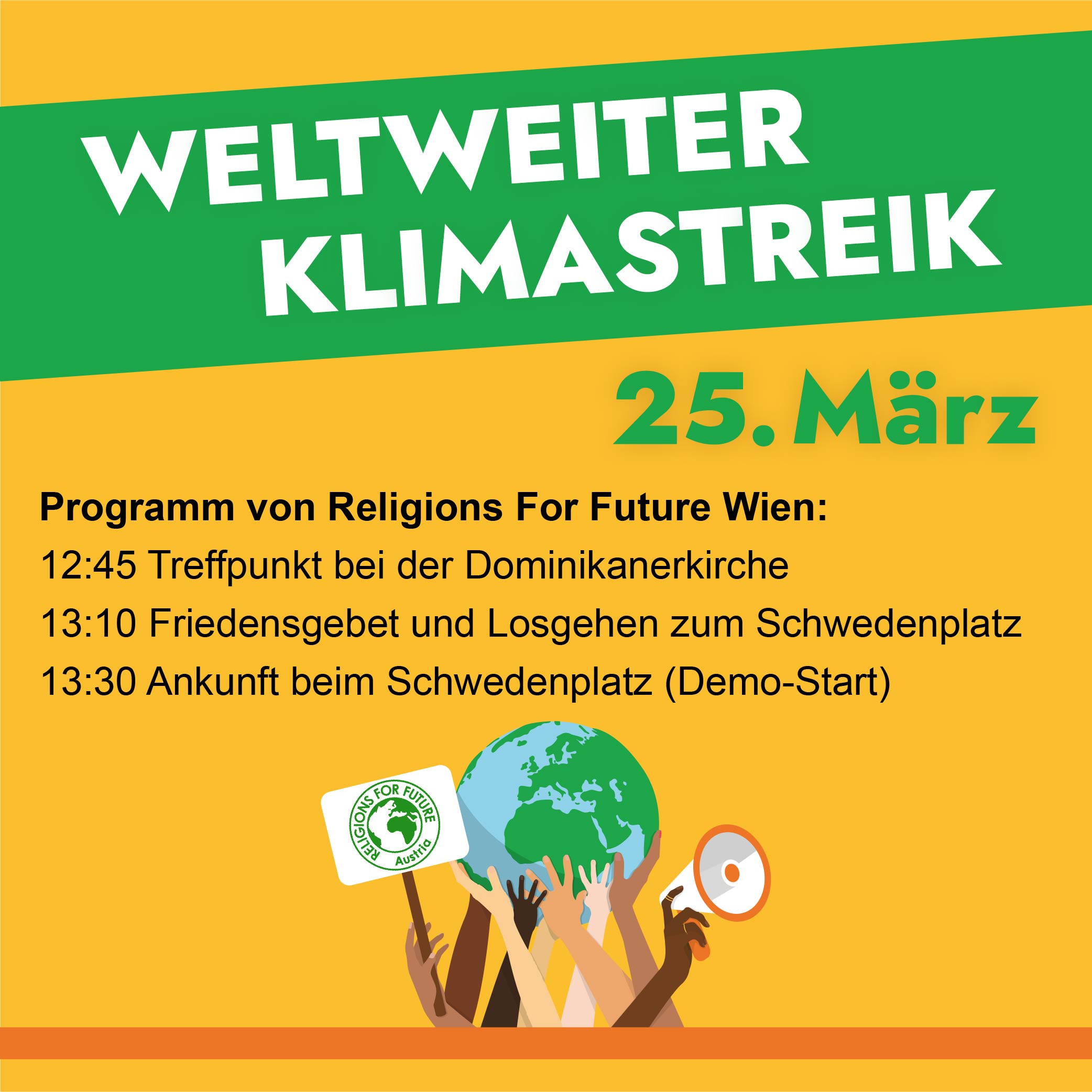 In Wien wird die Aktion wieder von "Religions for Future" unterstützt: Treffpunkt dafür ist am 25. März um 12:45 bei der Dominikanerkirche.