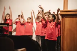 Kinder aus unterschiedlichen Klassen, Rassen, Hintergründen und Religionen singen gemeinsam internationale Lieder.