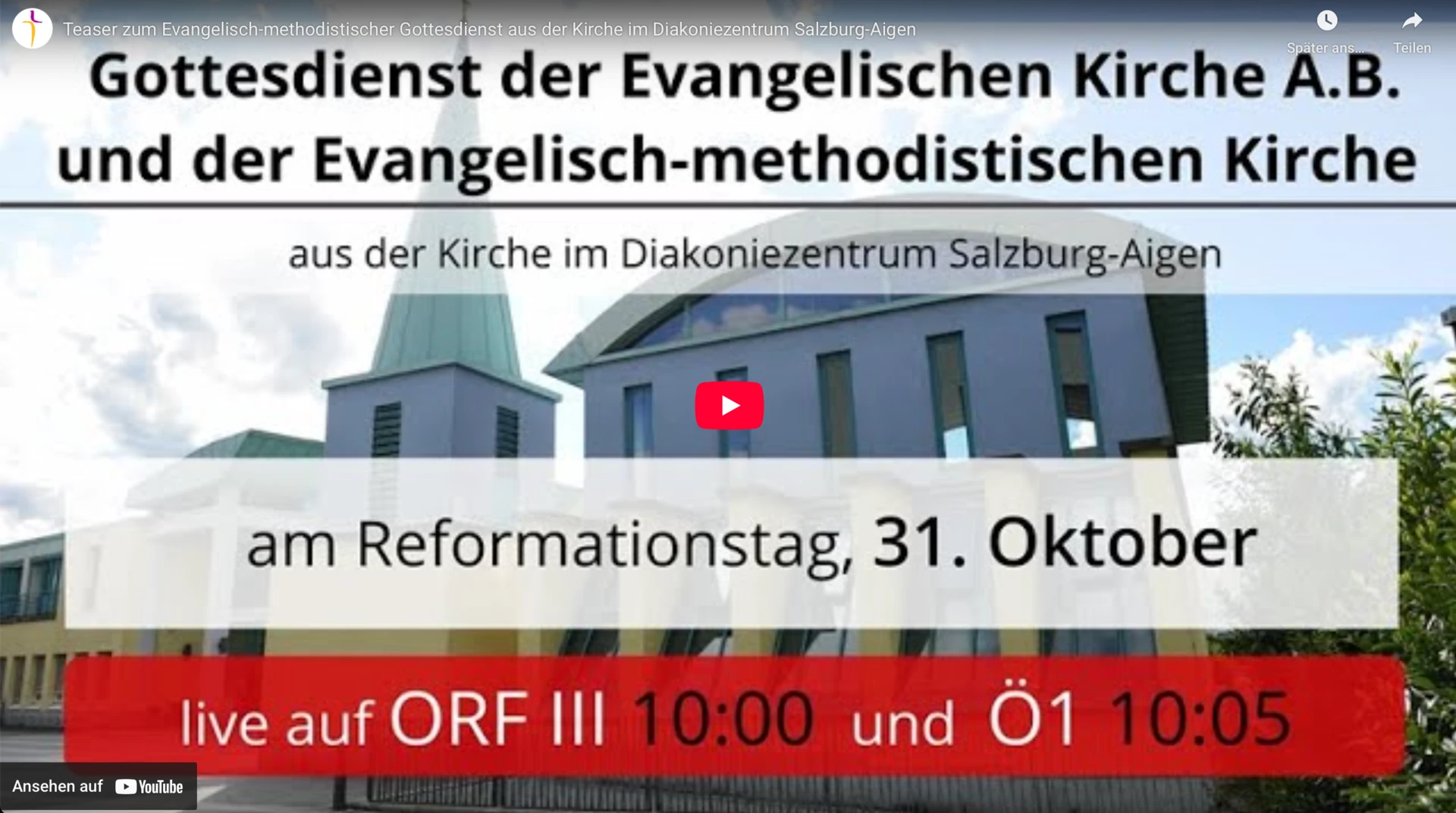 Der Reformationsgottesdienst am 31. Oktober aus der Kirche des Diakoniewerks in Salzburg wird live übertragen im Radio auf Ö1; im TV kann man in ORF III mitfeiern. Beginn ist 10.05 Uhr.