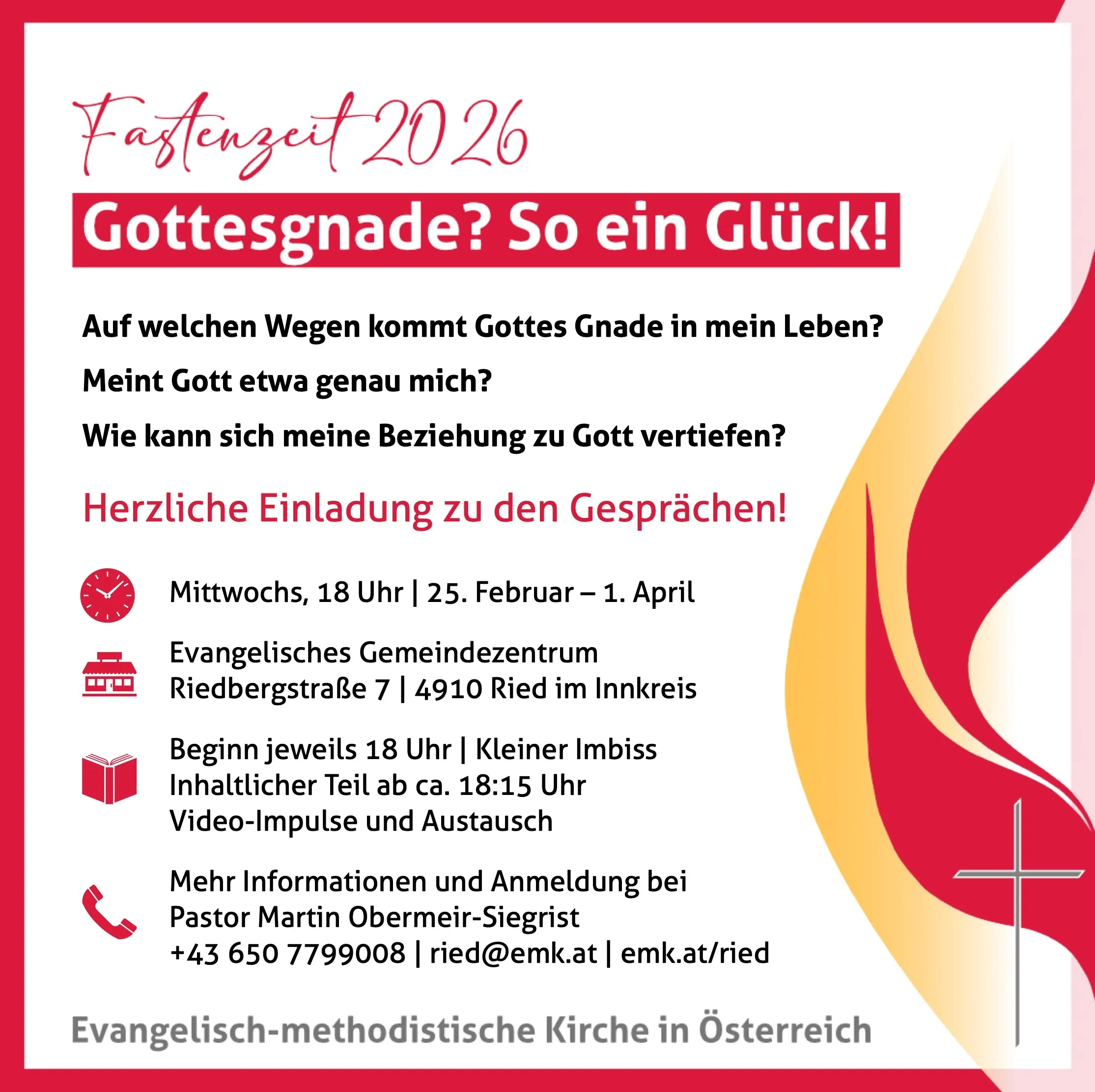 Das evangelisch-methodistische Gemeindeleben findet im Evangelischen Zentrum am Riedberg statt. Besuchen Sie auch die Website der Evangelischen Pfarrgemeinden in Ried im Innkreis, Braunau und Schärding: