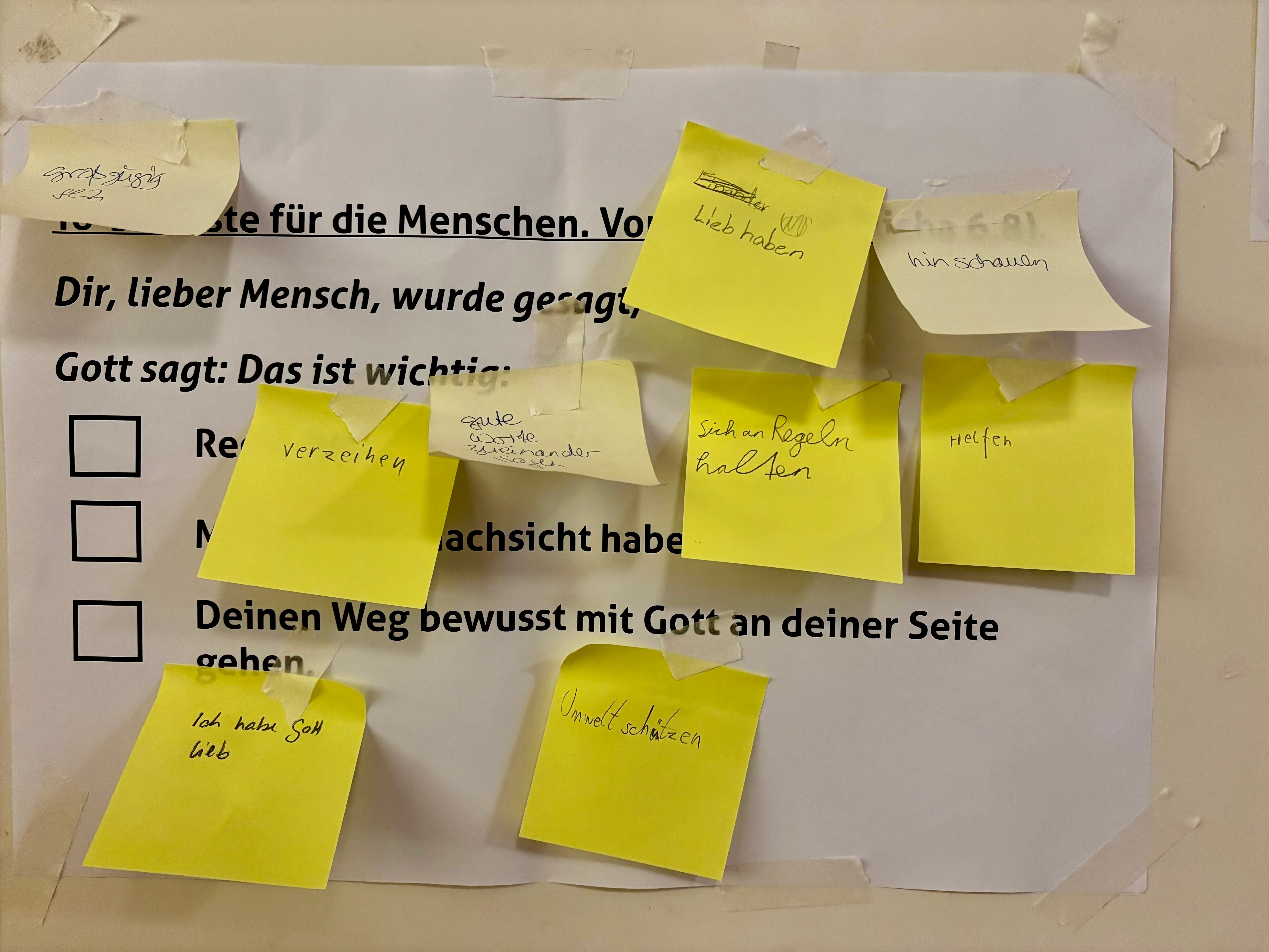 Es ist alles schon da. Es ist ganz einfach. Ihr habt vorhin die Kinder gehört (während der Kindergeschichte haben wir Beispiele notiert, wie das gehen kann – s. Bild). Schreibt nachher selbst etwas dazu. Notizzettel habe ich genügend dabei. Auch wenn, und das weiß ich wohl, es nicht immer einfach ist. Auch wenn wir uns allzu oft selbst in die Quere kommen. Da müssen wir nicht auf die Großen in den Nachrichten schauen oder mit dem Finger auf diesen oder jene zeigen. Da reichen wir selbst. Ja, so ist das: Tun ist schwer. Ich bin froh, dass Gott mir seine Gnade verspricht. Dass wir nachher zusammen das Abendmahl feiern. Dass Vergebung nicht nur ein frommes Wort ist, sondern Wirklichkeit. Ich brauche die Vergebung jeden Tag.