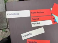Nach dem Essen dann das Schiebespiel mit den verschiedenen Gottesbildern – welches Bild von Gott brauche ich in welcher Situation? Und wenn ich nicht mehr schieben kann, dann ist Gott festgelegt und genau das ist mit dem Bilderverbot in der Bibel gemeint: Gott ist zu vielfältig und so über unsere Vorstellungen hinausgehend, dass wir ihn nicht in einem Bild "festhalten" können.