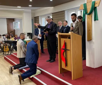 Then on Sunday, the UMC congregation in Pogradec hosted a service of ordination. Two lay pastors of the UMC in Albania, Gjergj Lushka (above left) and Florian Cela (above right), were ordained by Bishop Zürcher into the ministry of elders in the United Methodist Church, and appointed to serve as pastors of local churches.
