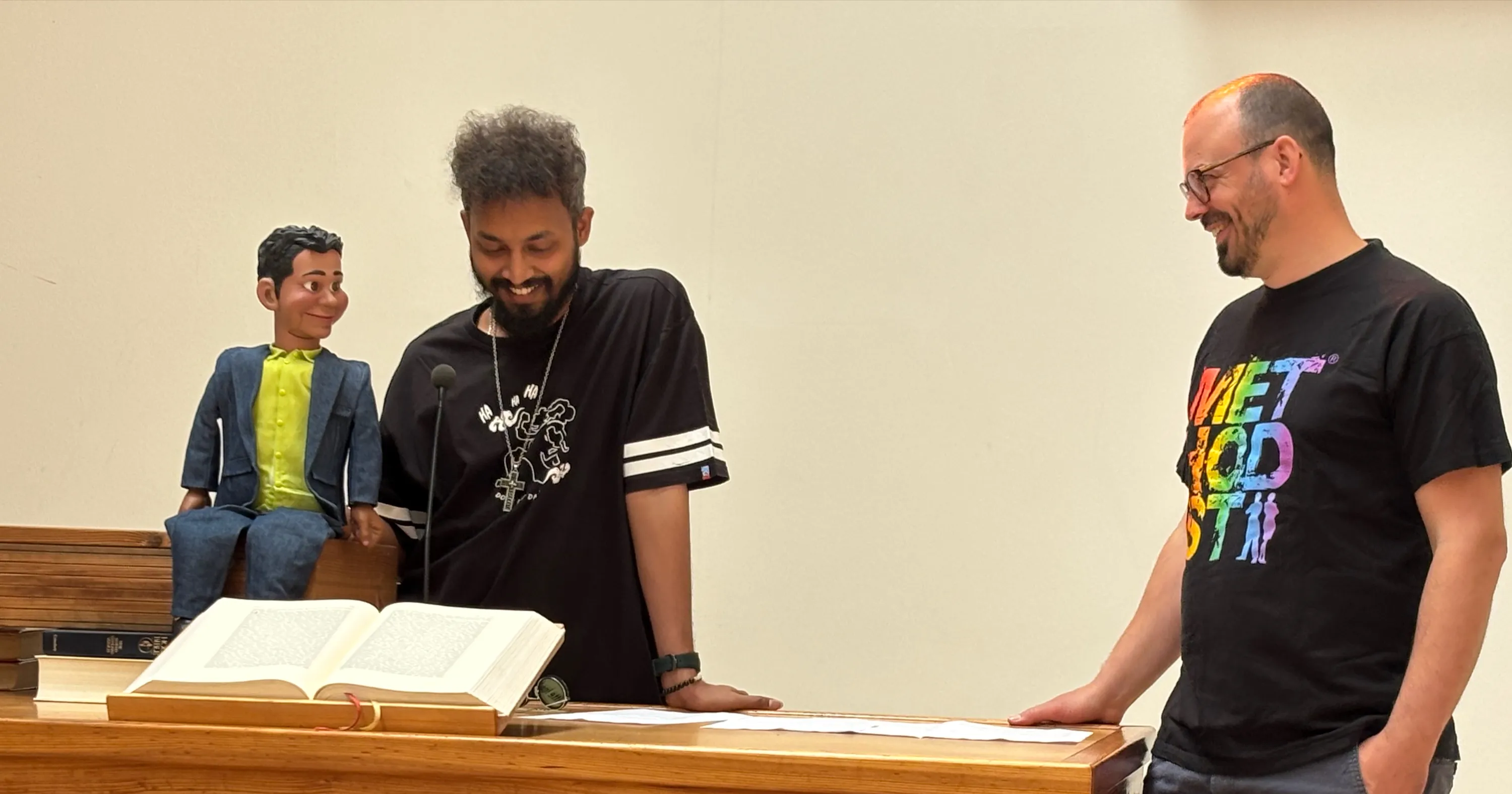 Global Mission Fellow Rev. Sam T. Rajkumar (ein Missionar unserer weltweiten Kirche, der derzeit in der GEKE Geschäftsstelle in Wien arbeitet) unterhält sich mit seiner Bauchrednerpuppe Tony und Pastor Martin Obermeir-Siegrist darüber, dass Gott uns kühn liebt: Gott betet nicht einfach aus der Distanz für uns, sondern kommt uns in Jesus nahe. Unser Leben kann Gottes Liebe widerspiegeln. Und zwar nicht nur im Nachdenken und Reden, sondern in konkreten Taten, wie Hilfe, Teilen und Solidarität.
