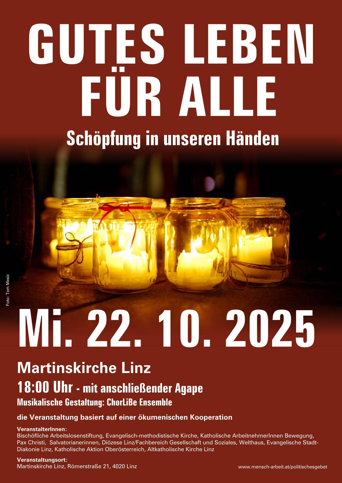 Sozialpolitisches Gebet „Gutes Leben für alle“ zum Thema Schöpfungsverantwortung am Mittwoch, 22. Oktober um 18 Uhr in der Linzer Martinskirche.