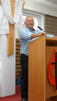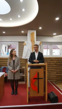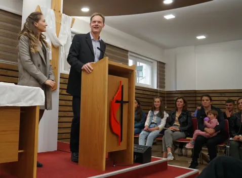 Am Sonntagnachmittag (9.10.), nach dem Gottesdienst in Tirana, fuhren wir über die Berge in die Stadt Pogradec. Pogradec ist ein Ort mit etwa 20.000 Einwohnern, der am Ufer des Ohridsees im Südosten Albaniens liegt. Als wir in der lokalen EmK-Gemeinde ankamen, wurden wir von Pastor Mustafa und den Mitgliedern seiner Gemeinde herzlich empfangen. Zu unserer großen Freude war auch eine Gruppe von 29 jungen Erwachsenen und Jugendlichen aus der EmK-Gemeinde Buzaishte, einem kleinen Dorf in den Mokra-Bergen, anwesend. Sie waren 2,5 Stunden über Bergstraßen gefahren, um mit uns den Gottesdienst zu feiern. Vor dem Gottesdienst führte uns der Pastor durch das neu erworbene und renovierte Gemeindehaus in Pogradec. Es umfasst eine Küche, einen Gemeinschaftsraum, einen Kirchensaal für etwa 100 Personen und mehrere Klassenräume für die Sonntagsschule und die Jugendarbeit. Der Gottesdienst war fröhlich, mit Liedern und Gebeten der örtlichen Gemeinde, der Predigt von Pastor Stefan und den Grüßen der englischsprachigen Gemeinde in Wien durch Pastor John.