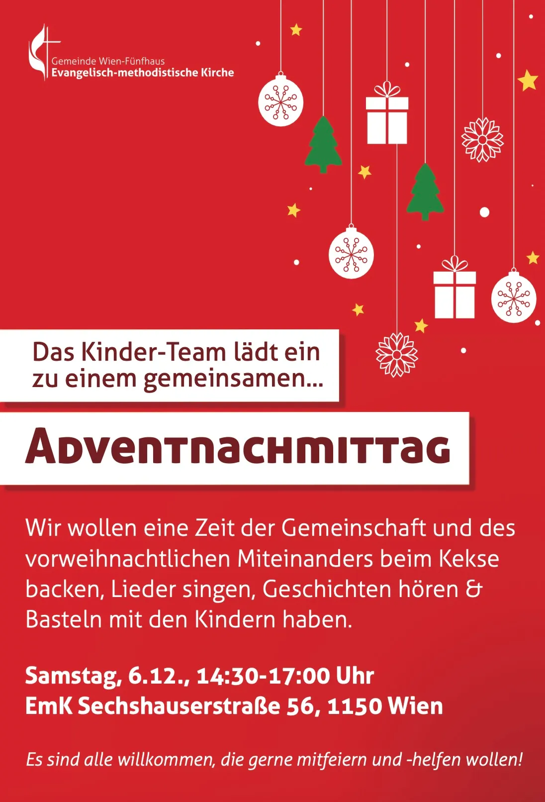 Das Kinder-Team aus Wien-Fünfhaus lädt alle Kleinen und Großen mit ihren Familien und Freund*innen und mit allen, die nicht alleine auf Weihnachten warten wollen, am 06.12.2025 zum Adventnachmittag ein.