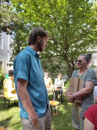 Den ganzen Winter über hat das Wärmestuben-Team, bestehend v.a. aus Personen aus der EmK Gemeinde Wien-Fünfhaus, der Gemeinde der ESUMC und der altkatholischen Gemeinde der Heilandskirche, unter der Leitung von Jutta Dietl mit viel Engagement und Herz jeden Dienstag etwa einhundert Gäste mit einem warmen Essen an einem warmen Ort versorgt. Am 06. Juni war nun das Team selbst an der Reihe, es sich gut gehen zu lassen: Beim Sommerfest wurden nicht nur gemeinsam Köstlichkeiten verzehrt, sondern es wurde auch auf die vergangene Saison zurückgeblickt, und man hatte noch einmal Zeit, miteinander zu plaudern und einen schönen Nachmittag im Garten miteinander zu verbringen. Etwa zwanzig Personen waren dabei. Drei Mitarbeitende wurden aus ihrem Dienst verabschiedet – nicht ohne ein herzliches Dankeschön und ein kleines Geschenk: Daniel Mohr, der Mission Fellow aus der EmK, hat seinen Dienst in Wien beendet und damit auch seinen Einsatz in der Wärmestube. Mit seiner Gelassenheit war er vor allem im Eingangsbereich eine wichtige Stütze. Elfie und Jakob Abderhalden haben die Gäste in der Wärmestube lange Jahre mit Gemüsestrudel, Bauernnockerln und Käsespätzle verwöhnt. Danke für eure Arbeit, ohne dieses große Team und seinen Einsatz würde es die Wärmestube nicht geben!