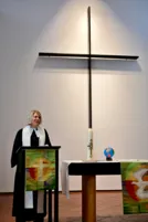 „Ich bringe meine Geschichte mit und sie verwebt sich mit eurer“, betonte Pastorin Antje Klein in ihrer Predigt. Anhand von Psalm 139, der selbst als eine Art Lebensgeschichte gelesen werden kann, verwies sie dabei auf ihre Wurzeln in der Evangelischen Landeskirche in Württemberg, in der sie konfirmiert wurde und erste Glaubenserfahrungen machen konnte. Sie erzählte davon, wie die verschiedenen Stationen ihres Lebenswegs sie bis nach Brasilien geführt haben. Und sie berichtete auch davon, wie sich überraschend vor einem Jahr ein Weg in den Dienst in der Evangelisch-methodistische Kirche in Österreich aufgetan hatte. Dass Gott da war und ist, das habe sie wie der Beter von Psalm 139 immer wieder tröstlich und tragend und als ermutigend erlebt. Nun gehe sie mit der Gemeinde in Wien weitere Schritte. „Dass das Neue, das daraus entsteht, tragfähig und strapazierbar ist; dass wir an dunklen, kratzigen Fäden nicht verzweifeln und dass es trotzdem mit Leichtigkeit durchsetzt ist – mit Gold und Glitzer, mit Sonnenstrahlen, mit Segen, mit Hoffnung und Vertrauen – das bitte ich Gott“, so Antje Klein.