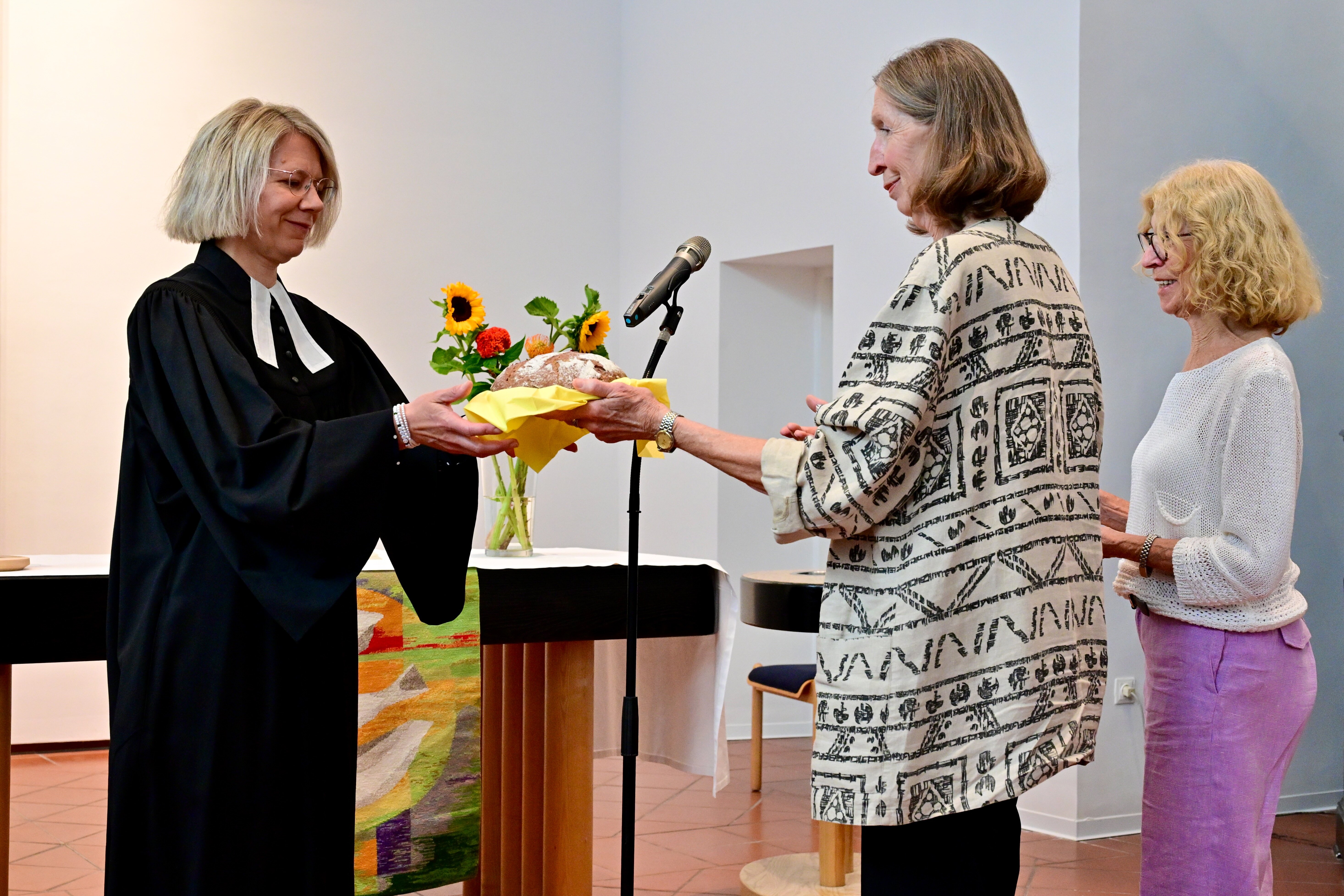 Die Gemeinde begrüßte die neue leitende Pastorin herzlich und verpflichtete sich dazu, sie durch ihr Gebet und ihre Mitarbeit im Dienst zu unterstützen. Verschiedene Gemeindeglieder überreichte symbolisch für diesen Dienst nötige Dinge wie Wasser, eine Bibel, Brot und Kelch, ein Gesangbuch, einen Globus und eine Kirchenordnung. Superintendent Schröckenfuchs legte der Pastorin eine Stola um als Zeichen dafür, „dass du in unserer Kirche zu einem Dienst berufen bist, in dem wir nicht uns selbst leben, sondern durch und für Christus, der uns sagt: ‚Nehmt auf euch mein Joch und lernt von mir… Denn mein Joch ist sanft, und meine Last ist leicht.’“