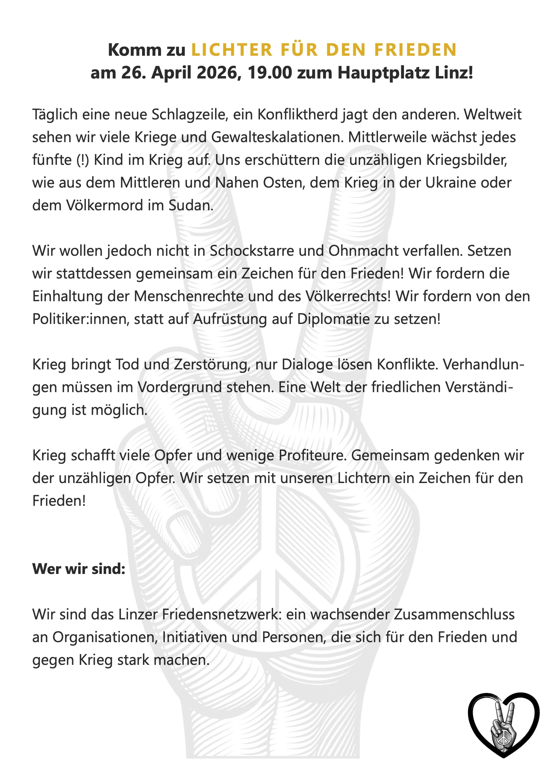 Als Teil einer wachsenden Friedens-Vernetzung entzünden wir am 26. April um 19 Uhr am Linzer Hauptplatz Lichter für den Frieden