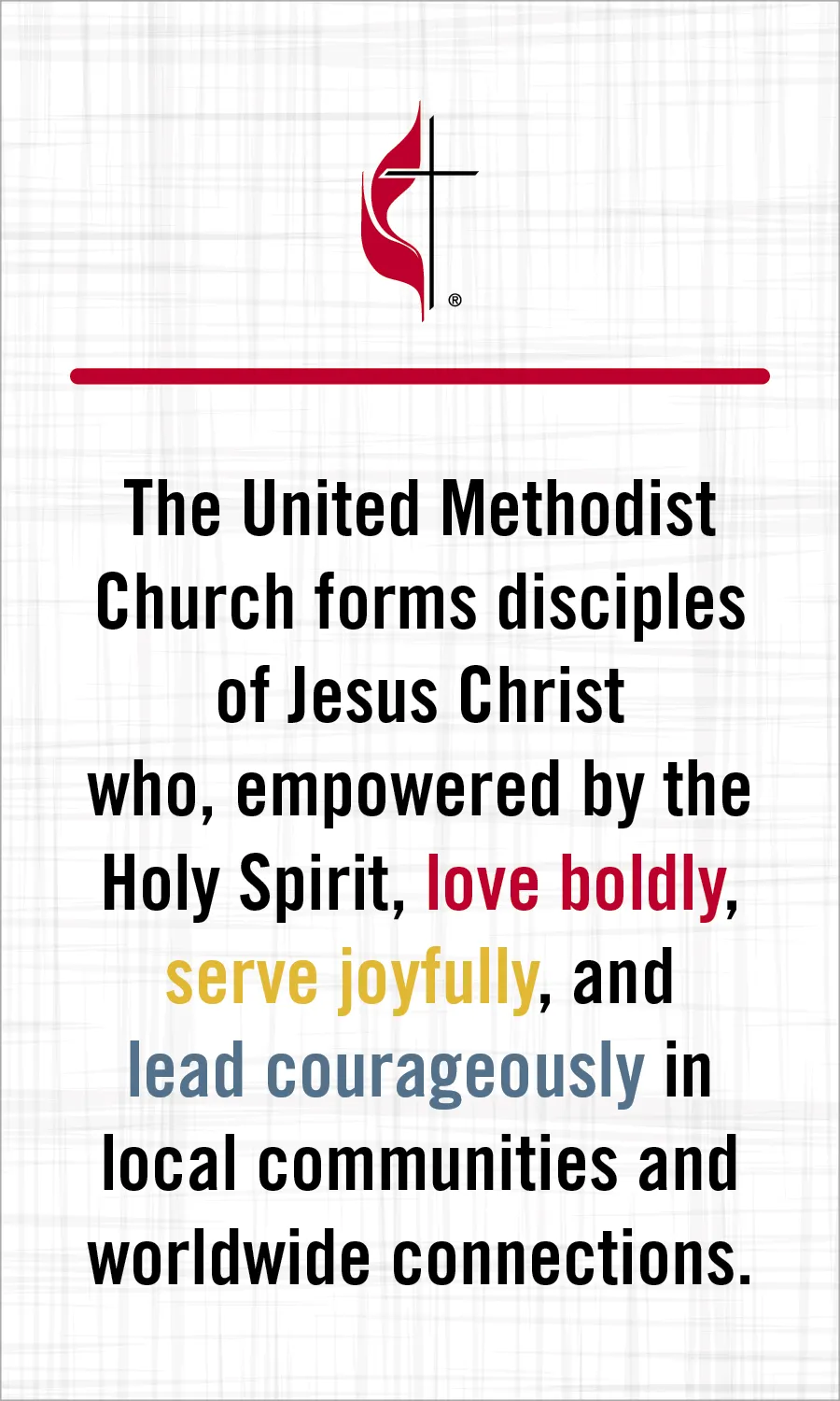 »Die Evangelisch-methodistische Kirche leitet Menschen dazu an, Jesus Christus nachzufolgen. Der Heilige Geist befähigt sie dazu, kühn zu lieben, bereitwillig zu dienen und entschlossen voranzugehen.«