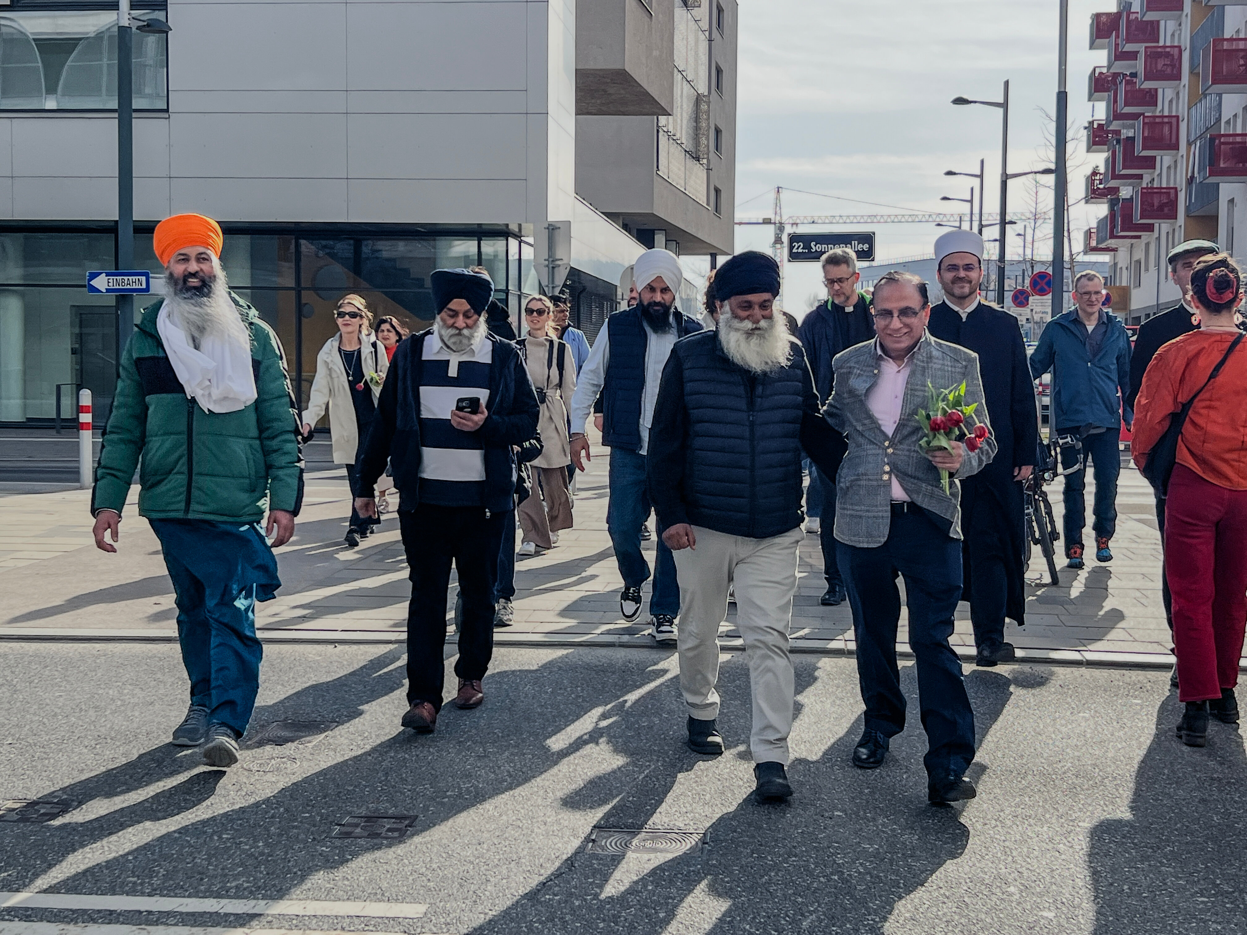 Mehr als 150 Personen aus den verschiedenen Religionsgemeinschaften haben sich dem gemeinsam Weg vom römisch-katholischen Edith-Stein-Zentrum in der Seestadt Aspern zum Gelände des Campus der Religionen angeschlossen, wo die Wiener Erklärung – Religionen für den Frieden – feierlich unterzeichnet wurde.