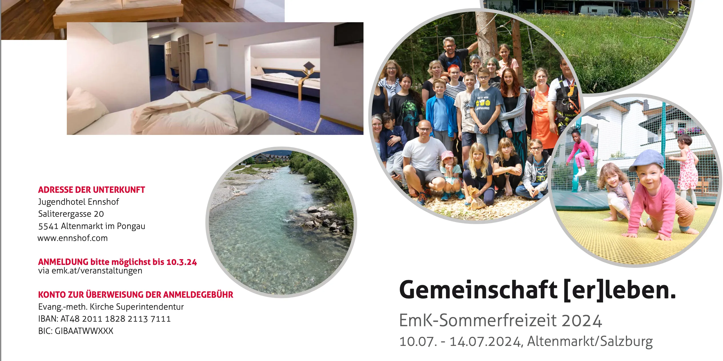 Gleichzeitig gibt er einen Überblick über die gesamtösterreichischen Veranstaltungen der kommenden Monate, soweit die Details dazu schon feststehen. Besonders hinweisen möchte ich auf die Veranstaltungen im Sommer: im Juli findet wieder die gesamtösterreichische Sommerfreizeit in Altenmarkt statt; und im August die Kinder- und Jugendwoche. Zu allen drei Veranstaltungen kann man sich schon jetzt anmelden!