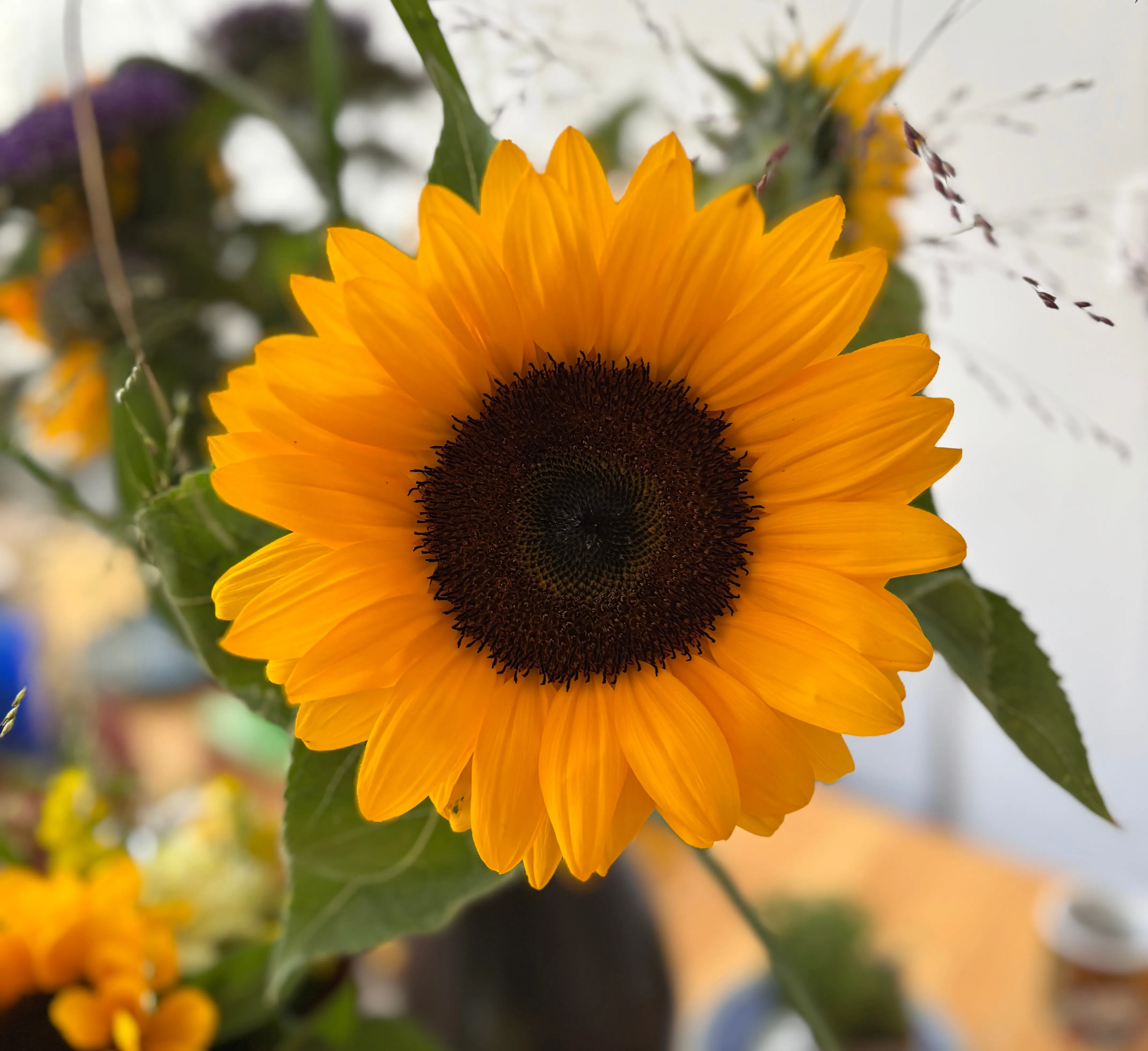 Der Sommer hat sich verabschiedet. Es ist Herbst. Und dann denk ich daran: Herbst ist Erntezeit. Nicht nur, was die Ernte angeht, die derzeit auf den Ständen am Markt so reichlich zur Verfügung steht und die mich staunen lässt angesichts ihrer Fülle. Ich kann gar nicht so viel tragen wie ich gerne mitnehmen würde. Manchmal nehme ich einen Strauß Sonnenblumen mit (so wie auf dem Bild - der allerdings ist von meiner Einsetzung als leitende Pastorin der Gemeinde, und auch für dieses schöne Fest bin ich sehr dankbar!). Der Strauß erinnert mich die Woche über an die Freude der Dankbarkeit, auch dann, wenn der Himmel mal grau ist. Manchmal hab ich den Psalmvers im Ohr: „Danket dem Herrn, denn er ist freundlich, und seine Güte währet ewiglich.“ (Psalm 118,1)