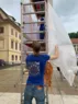 Das Zelt, das nirgendwo sein darf: Als Symbol für Menschen die keinen Fuß auf den Boden bringen dürfen, um eine neue Existenz anfangen zu können, steht das Zelt „im Himmel“ - hoch oben auf einem fahrbaren Gerüst. Anstatt das Zelt mit den Menschen auf den Boden zu bringen, wird es von einem Ort, von einem Lager, von einem Land zum nächsten geschoben.
